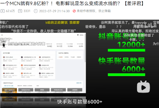 国内科技自媒体“差评”,在不久前对相关MCN机构的从业者,进行了一次采访。当聊到公司运营规模时,该MCN机构的负责人表示,光是他们这一家从事电影解说短视频账号孵化以及相关培训的公司,旗下就有多达12000个抖音账号和6000多个快手账号。这些账号专门负责产出这样的电影解说视频,就像是工厂的流水线,源源不断地为短视频平台的用户们,输送各种或热门或小众的电影解说视频。