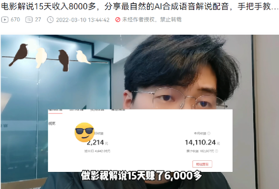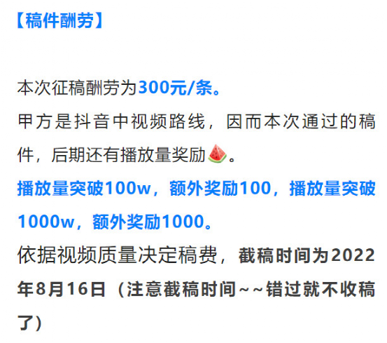 你甚至可以通过一些渠道,寻找到相关解说视频的文案征稿信息。所以说,就连看上去流水账般的解说文案,实际也都是这些账号所有者花钱雇人写的。他们只需要给这些花钱买来的文案,再配上AI合成音,剪成一段视频,就能获得相当可观的收入——毕竟,他们开给文案作者的报价,基本都是单条三百元起步,可见一部成功的电影解说视频所能创造的收益,起码要在千元以上。
