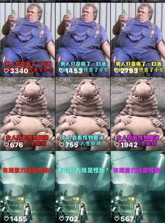 这些称号可以反复出现在不同的电影解说中,看多了后,你甚至都能下意识地比解说更早想好角色们的绰号。反正一部五分钟的短视频过后,观众大概率也不会记得这些大壮、小美的长相,他们会被不断出现的“新大壮”和“新小美”们替代,就好像科幻电影中,同一条流水线上生产出的相同型号的机器人。