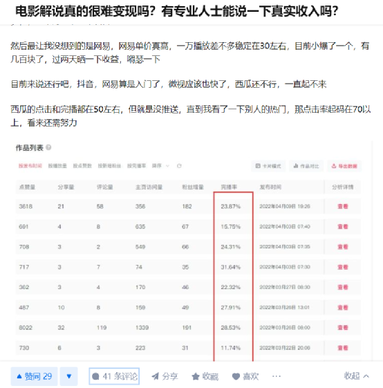网友分享的自己刚开始做电影解说短视频时的收益 图源:知乎用户@七姥爷