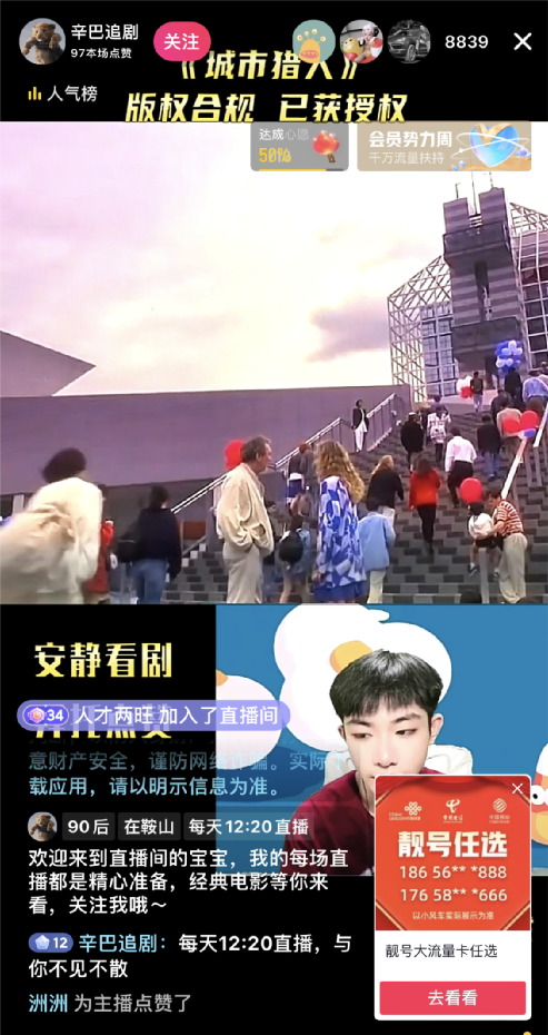 这类直播的形式,一般都非常固定。主播打开某部获得正版授权的电影或剧集,然后全程不说话地陪着观众一起看片追剧。直播画面中,除了有电影和主播的正面特写外,下方还会附带诸如低价买电影票和手机靓号的链接。别以为这看上去赚不了多少钱,实际上一些粉丝基础较好的主播,光是这样每天开一两个小时直播,陪粉丝看看电影,每月就可以获得几千元的收入。