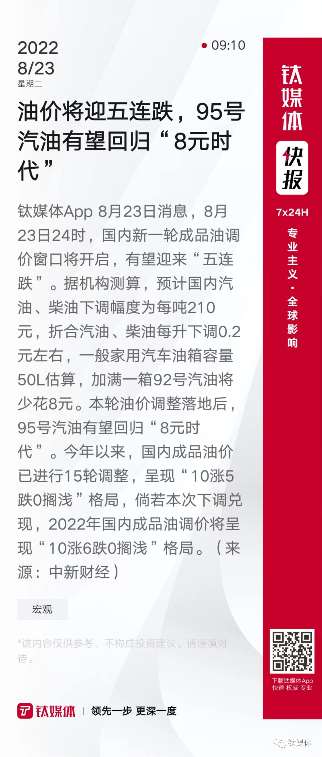 【油价将迎五连跌,95号汽油有望回归“8元时代”】