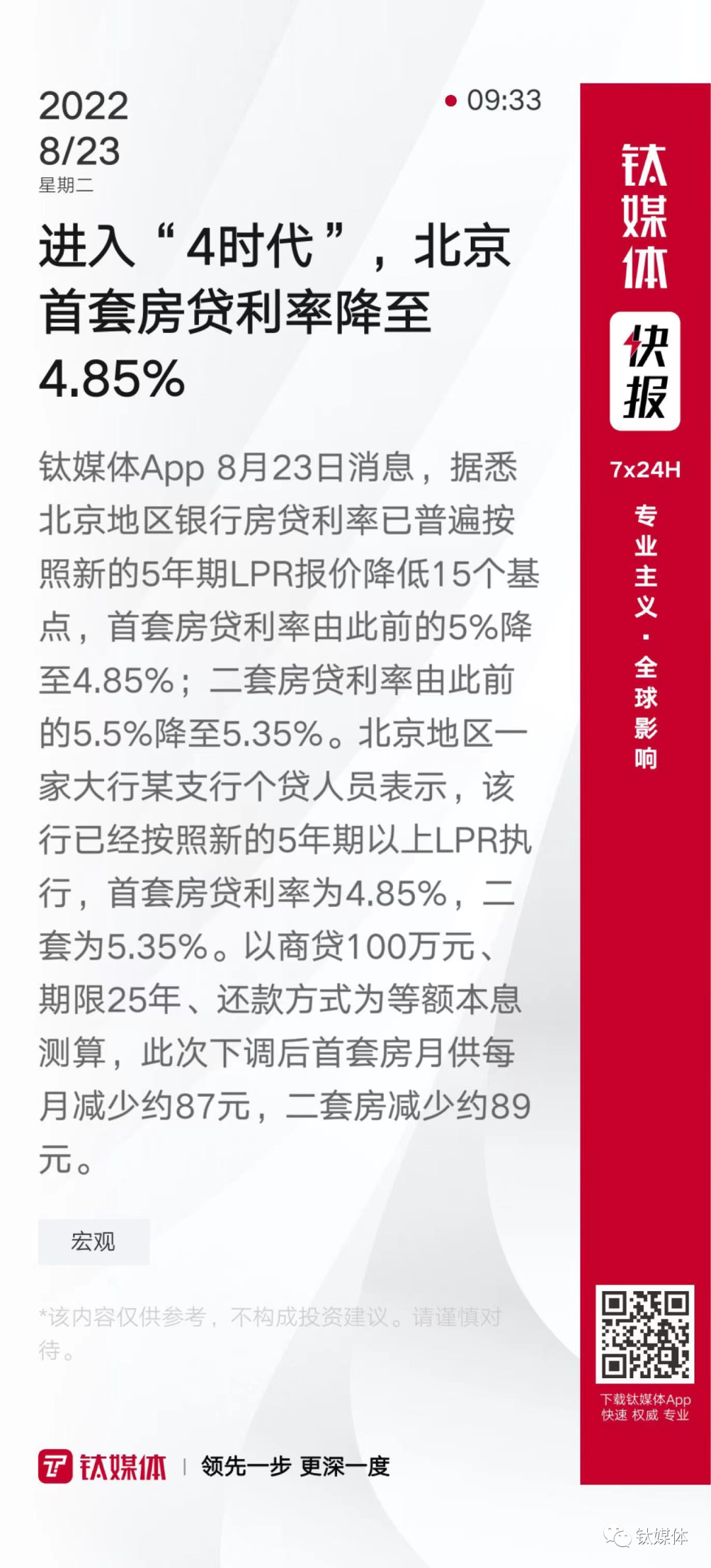 【进入“4时代”,北京首套房贷利率降至4.85%】