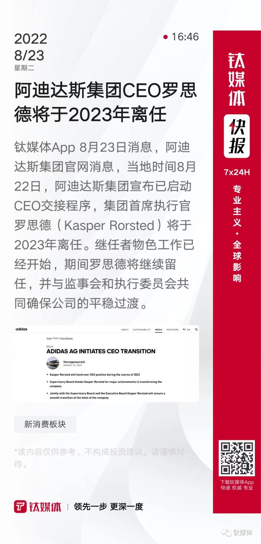【阿迪达斯集团CEO罗思德将于2023年离任】