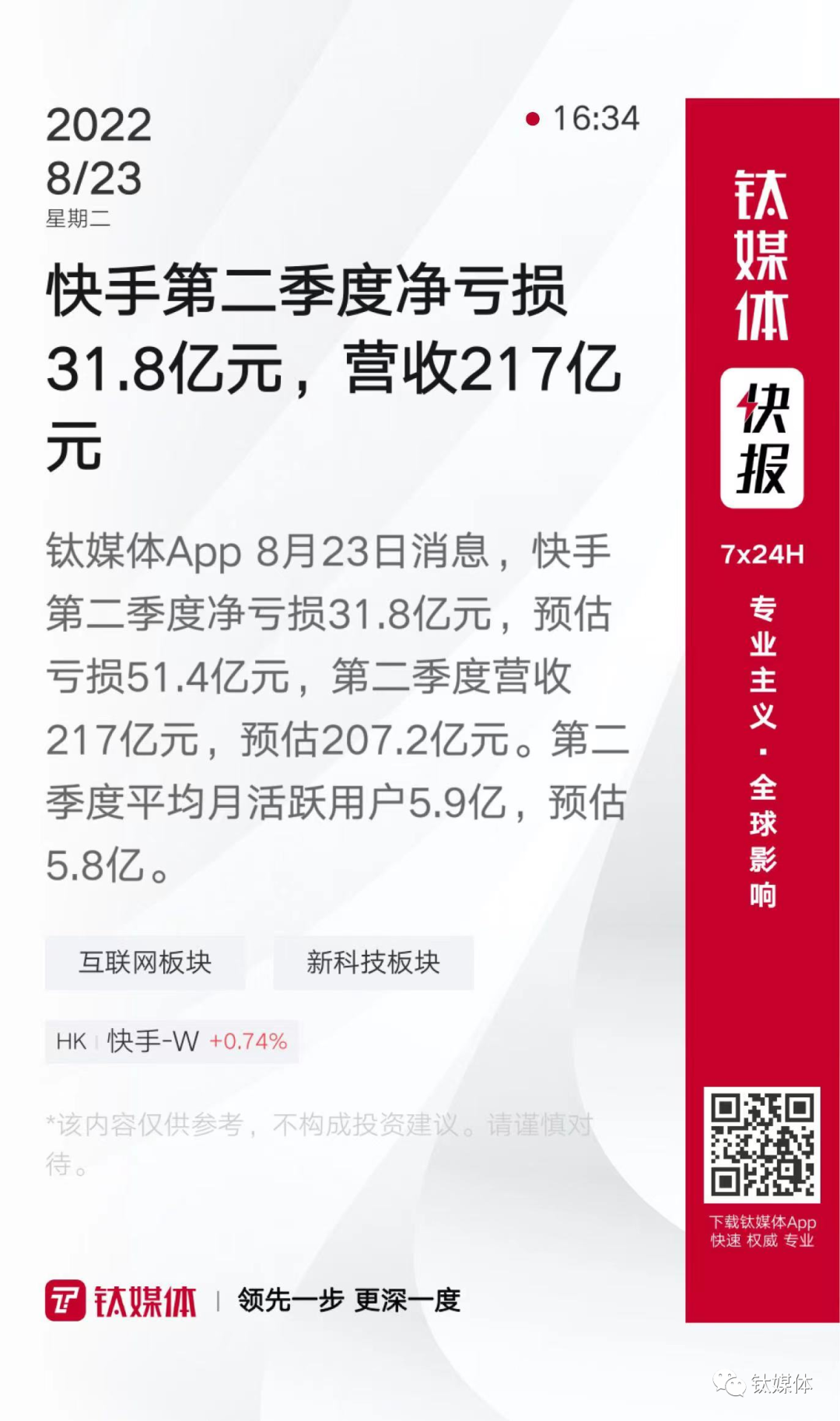 【快手第二季度净亏损31.8亿元,营收217亿元】