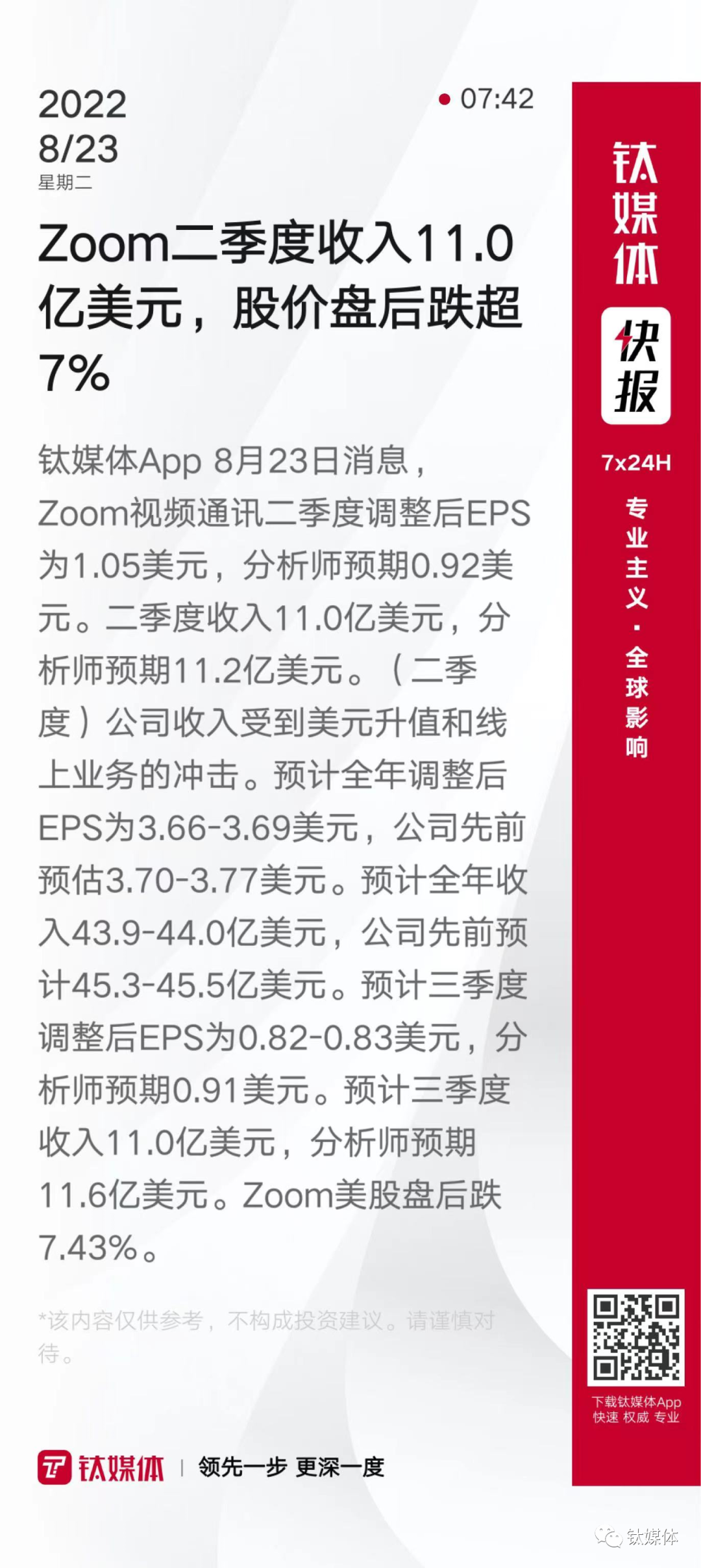 【Zoom二季度收入11.0亿美元,股价盘后跌超7%】