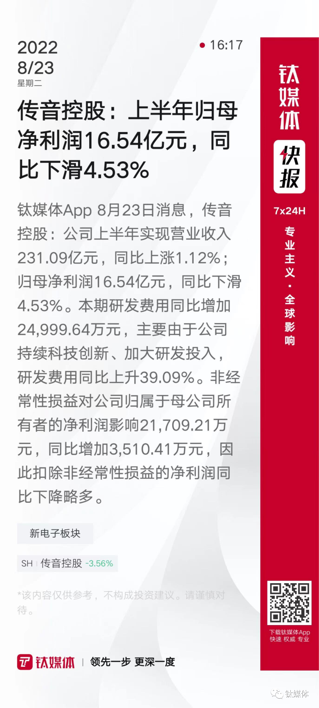 【传音控股:上半年归母净利润16.54亿元,同比下滑4.53%】