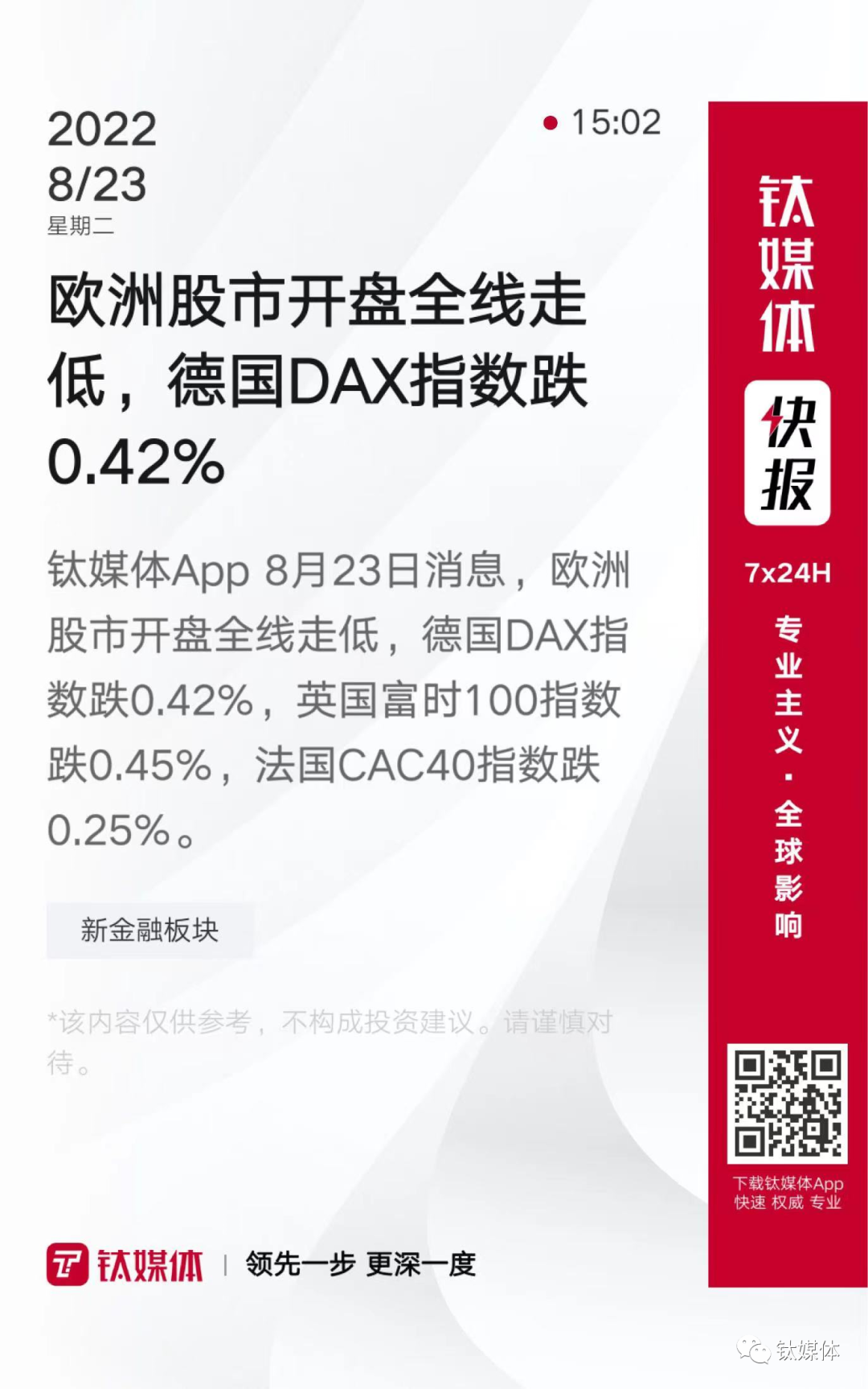 【欧洲股市开盘全线走低,德国DAX指数跌0.42%】