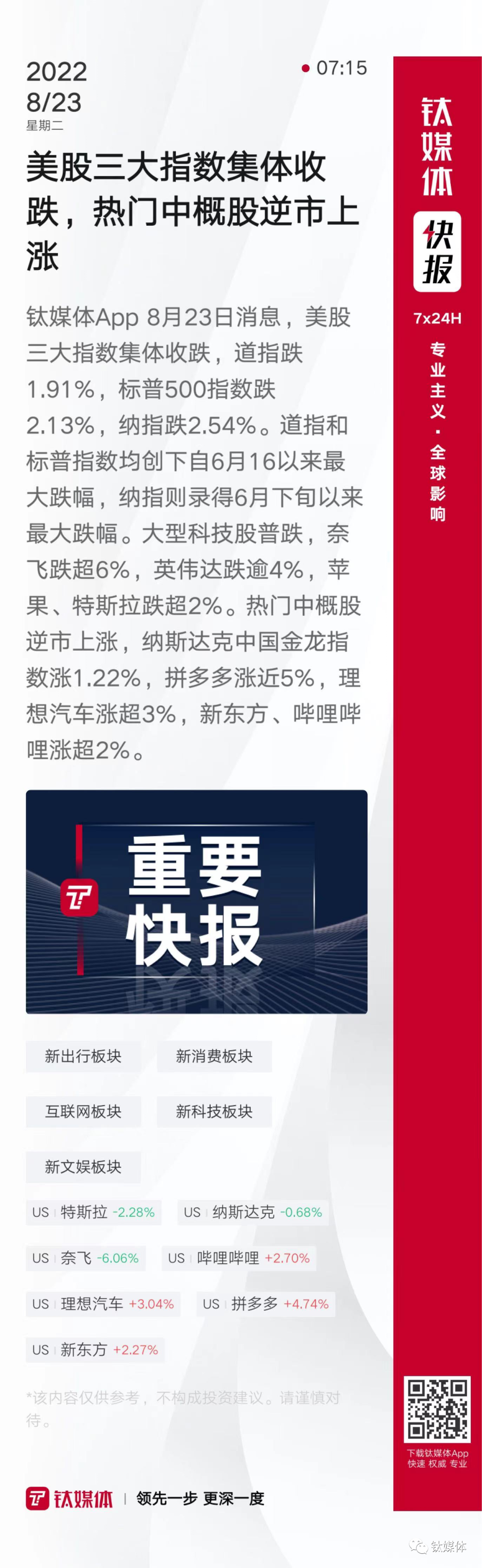 【美股三大指数集体收跌,热门中概股逆市上涨】