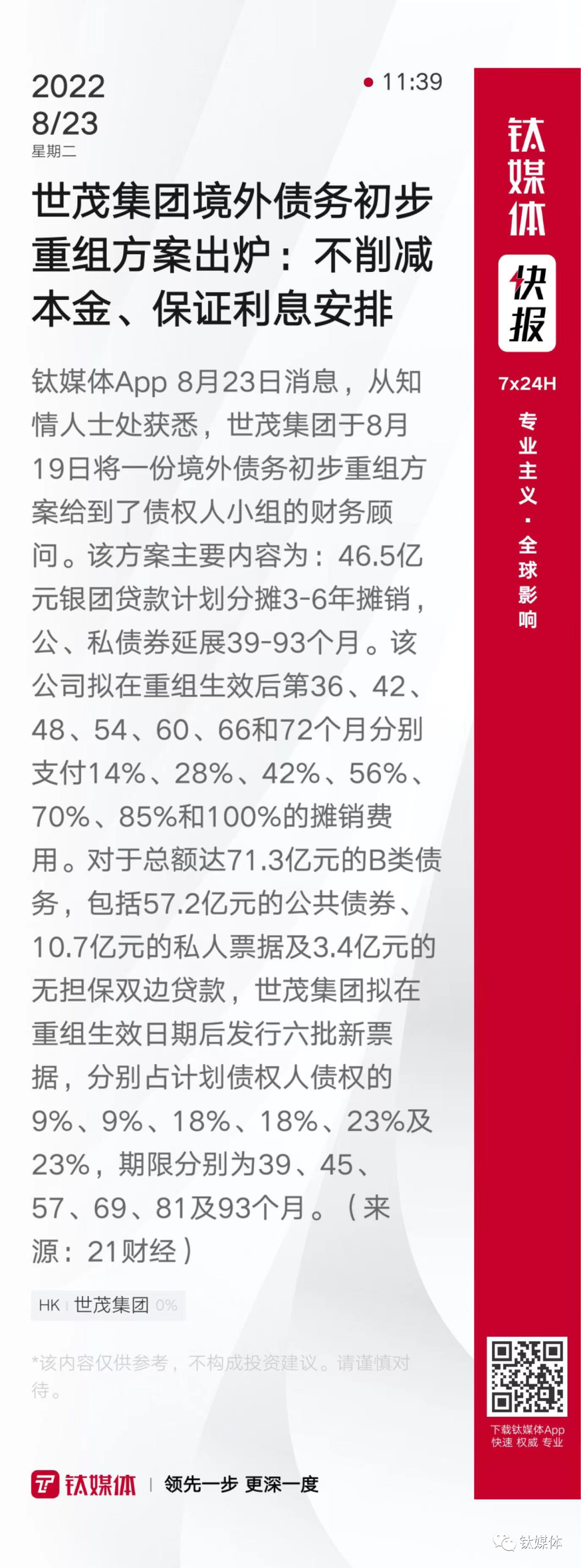 【世茂集团境外债务初步重组方案出炉:不削减本金、保证利息安排】