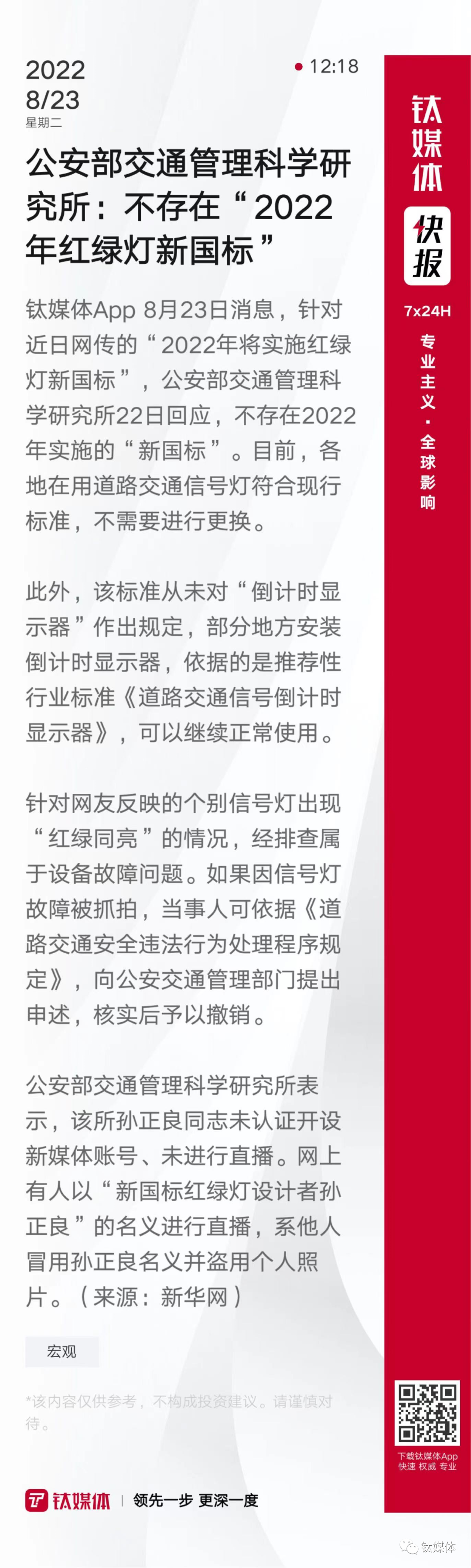 【公安部交通管理科学研究所:不存在“2022年红绿灯新国标”】