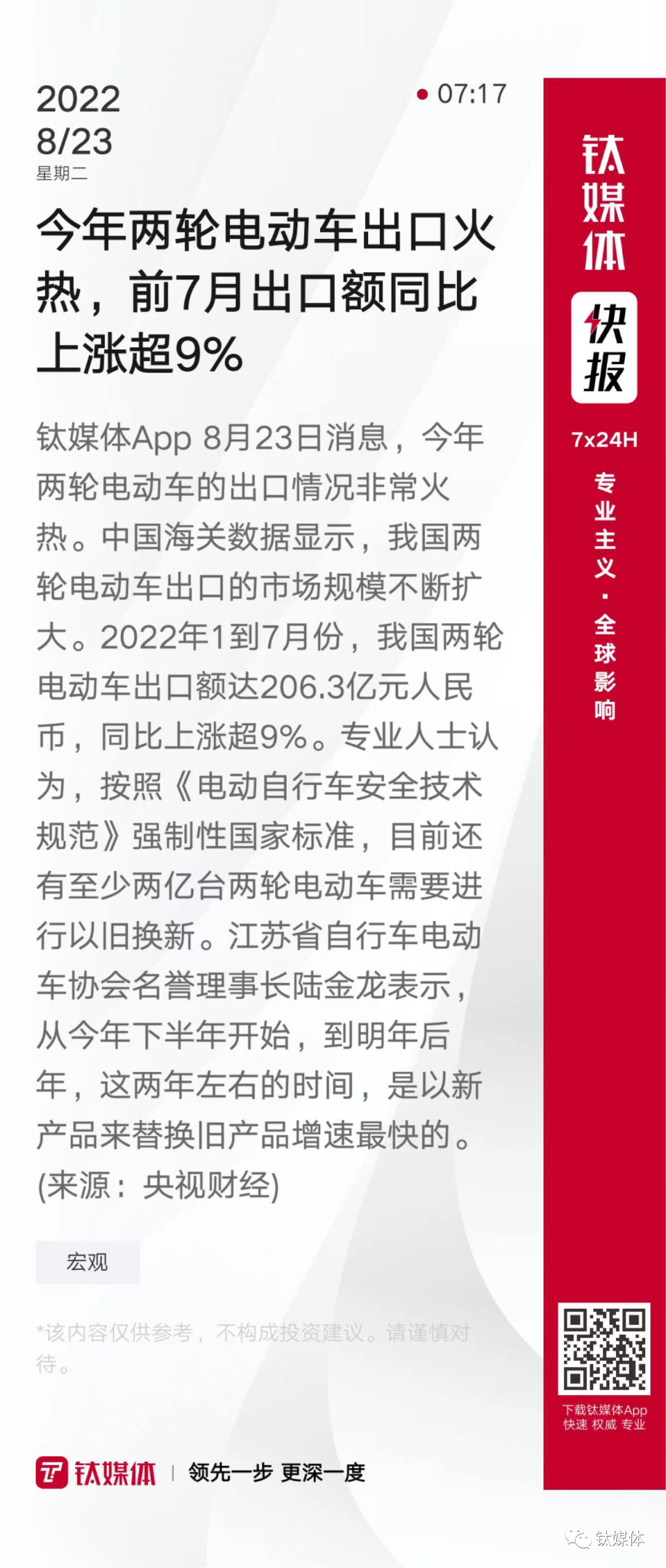 【今年两轮电动车出口火热,前7月出口额同比上涨超9%】