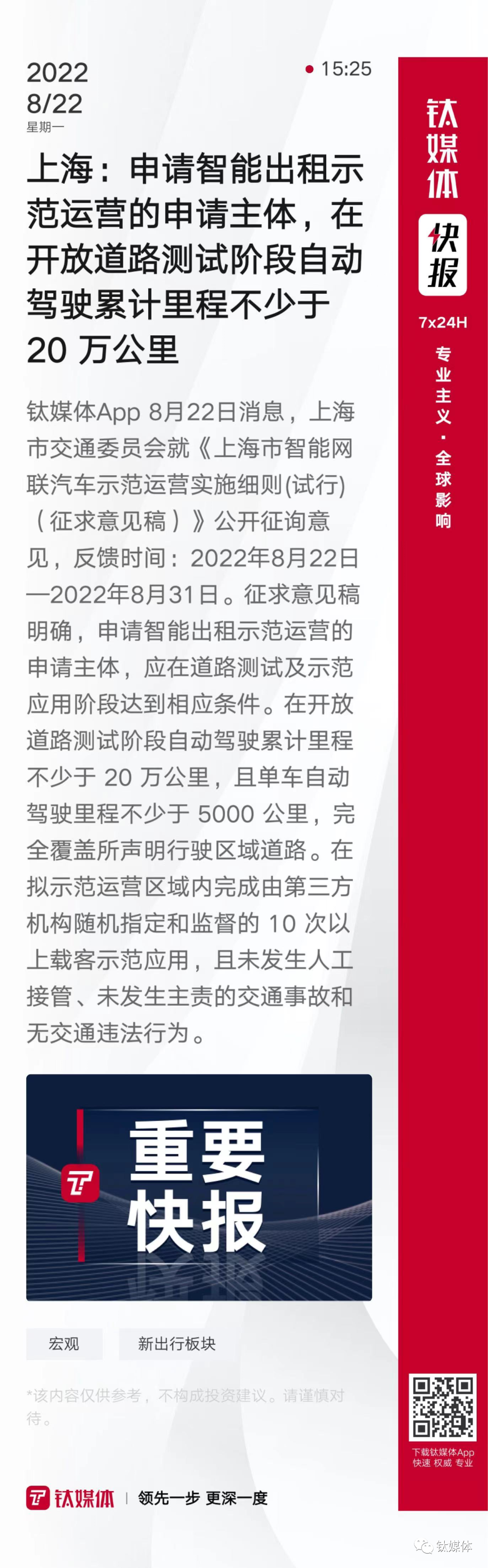 【上海:申请智能出租示范运营的申请主体,在开放道路测试阶段自动驾驶累计里程不少于 20 万公里】