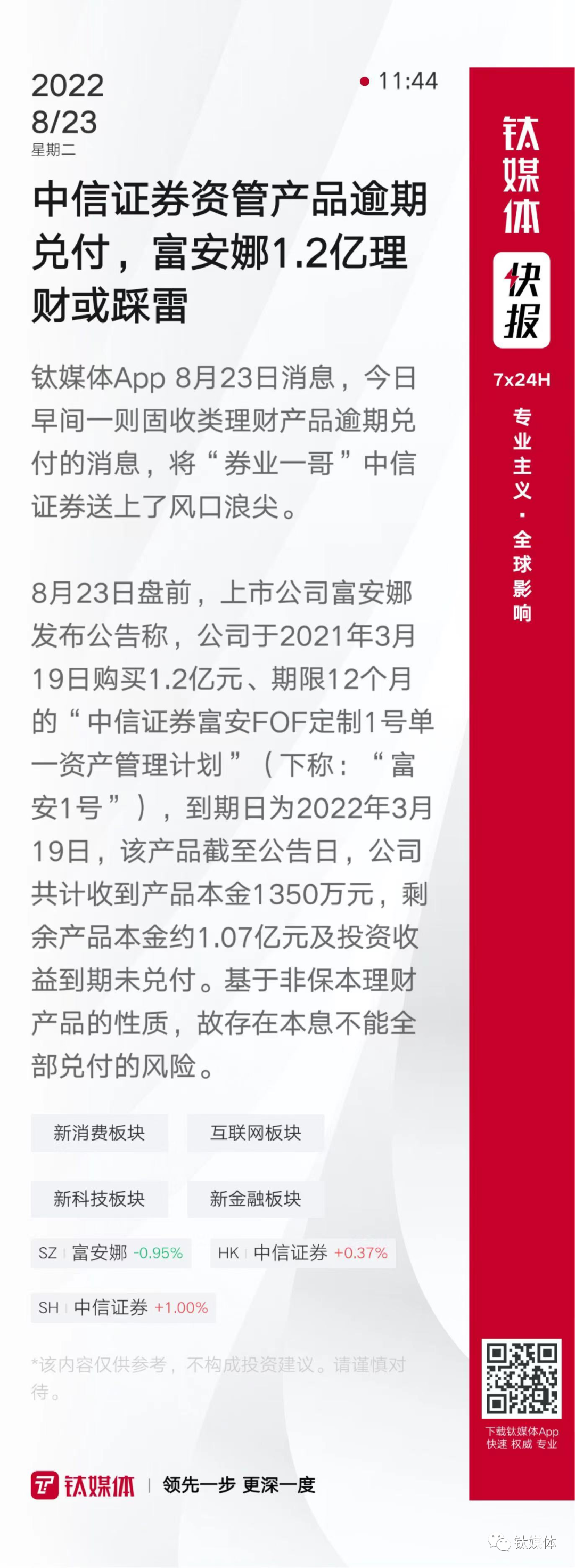 【中信证券资管产品逾期兑付,富安娜1.2亿理财或踩雷】