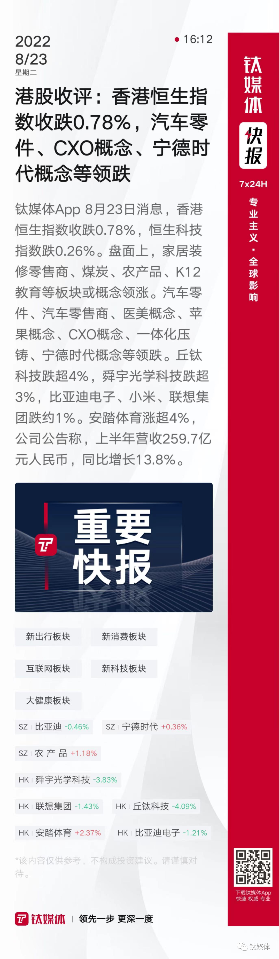 【港股收评:香港恒生指数收跌0.78%,汽车零件、CXO概念、宁德时代概念等领跌】