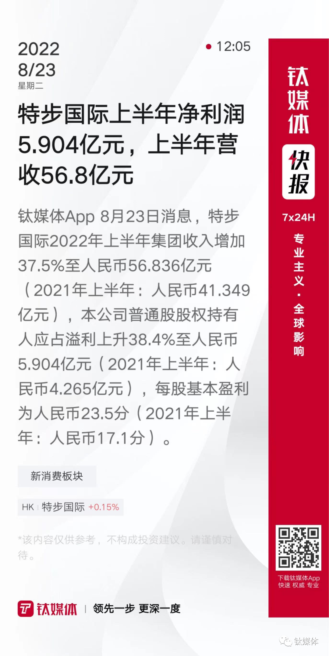 【特步国际上半年净利润5.904亿元,上半年营收56.8亿元】
