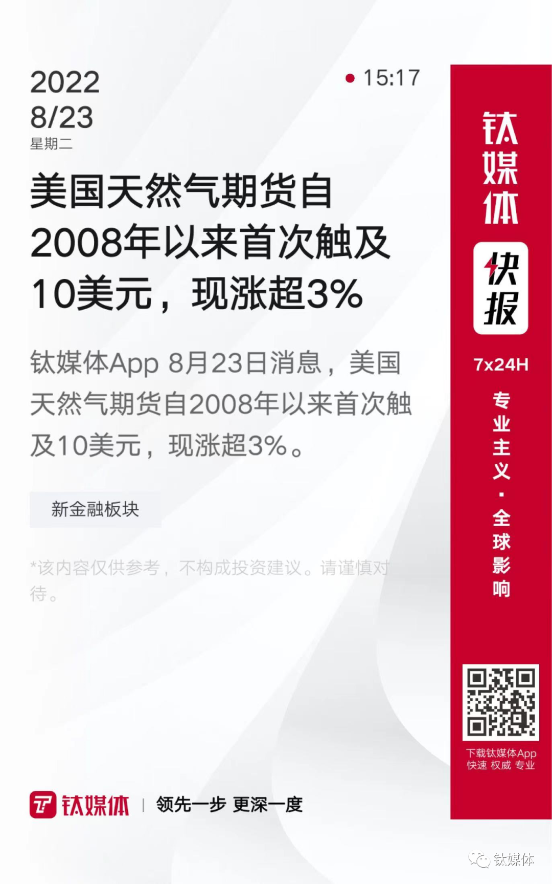 【美国天然气期货自2008年以来首次触及10美元,现涨超3%】
