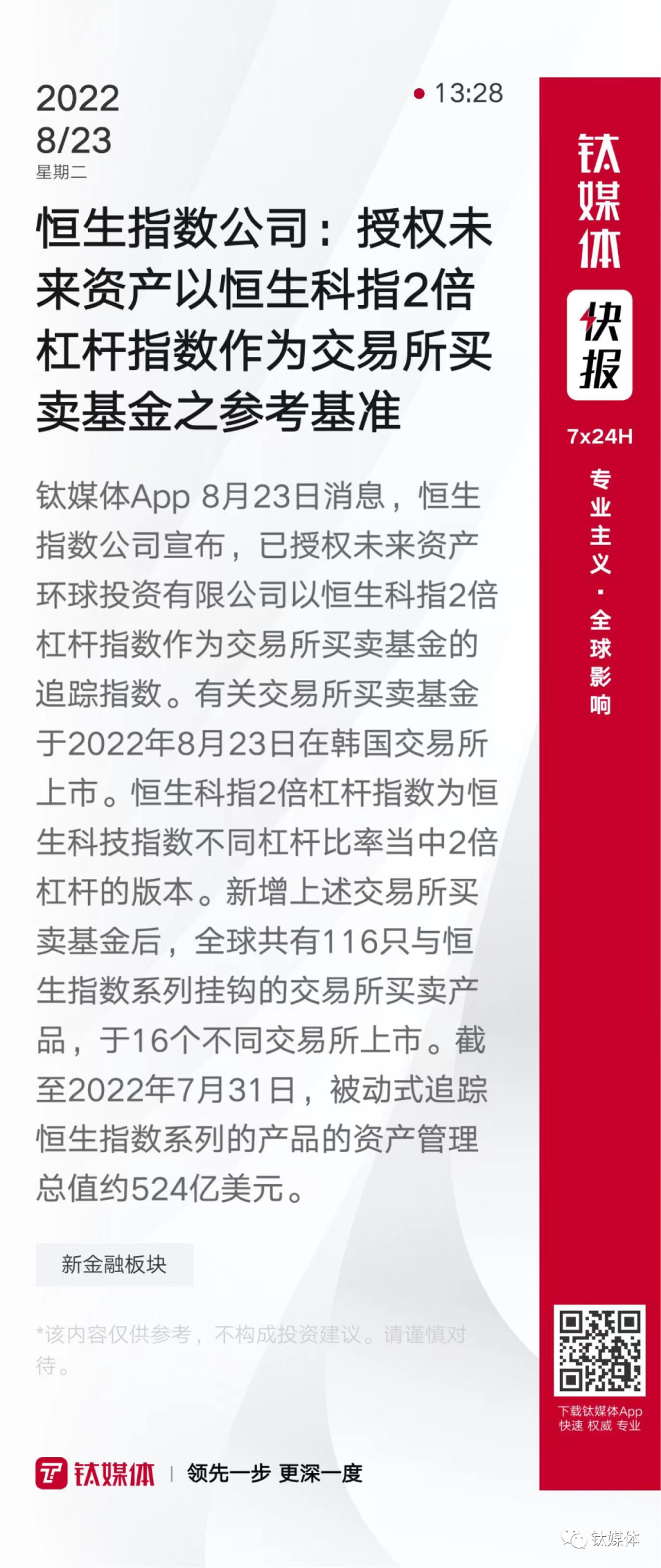 【恒生指数公司:授权未来资产以恒生科指2倍杠杆指数作为交易所买卖基金之参考基准】