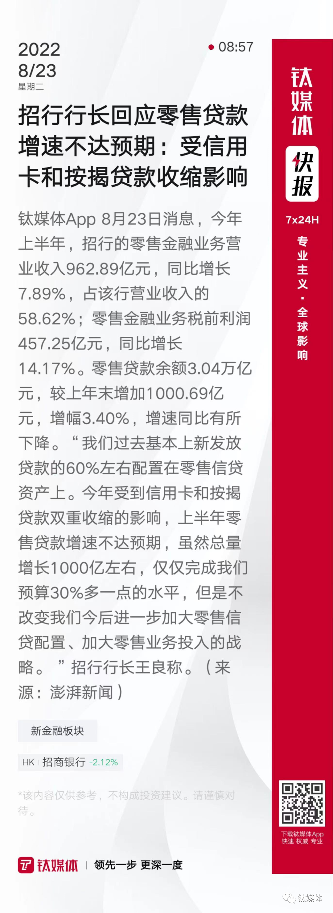 【招行行长回应零售贷款增速不达预期:受信用卡和按揭贷款收缩影响】