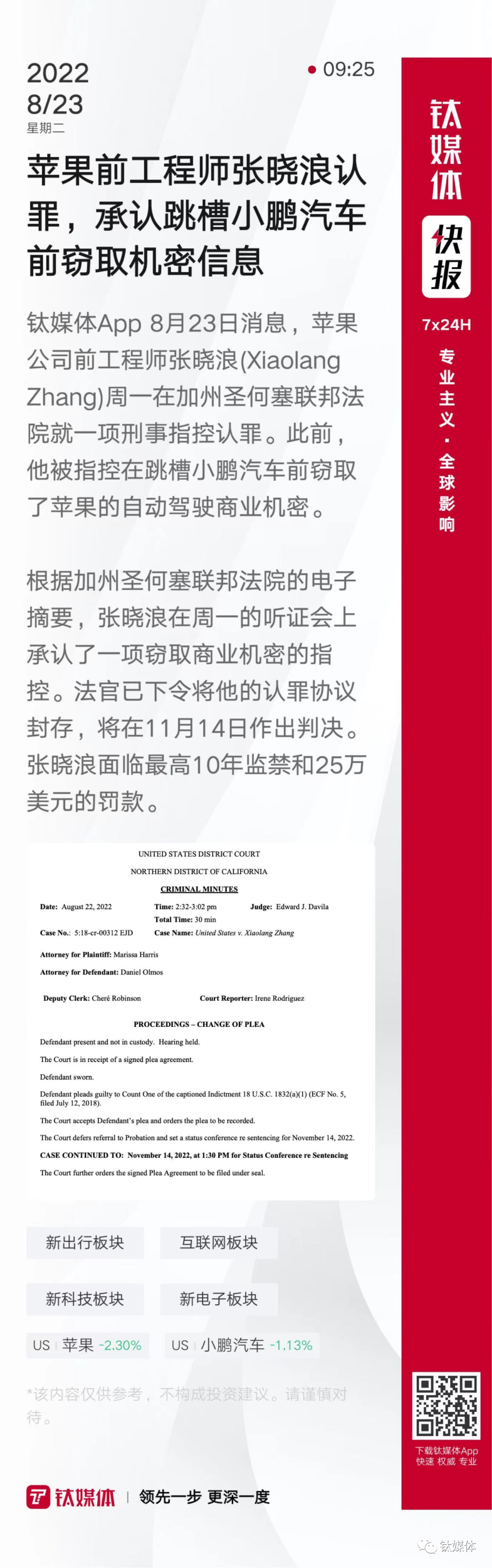 【苹果前工程师张晓浪认罪,承认跳槽小鹏汽车前窃取机密信息】