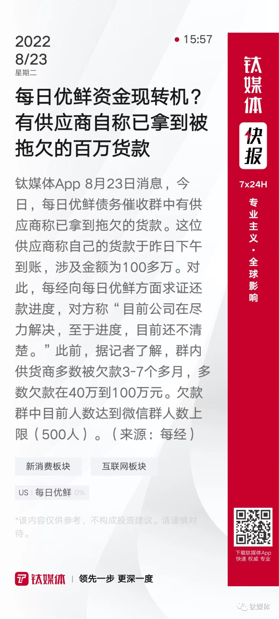 【每日优鲜资金现转机?有供应商自称已拿到被拖欠的百万货款】