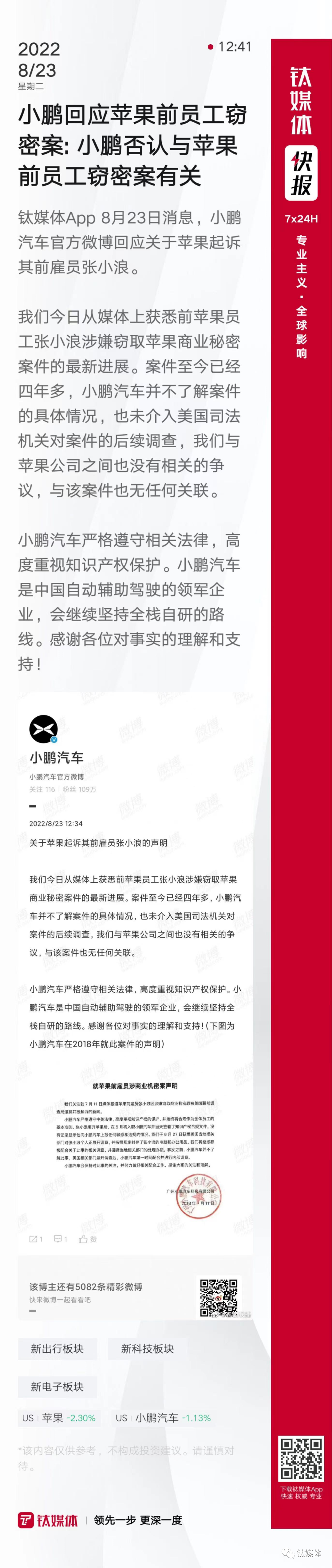 【小鹏回应苹果前员工窃密案: 小鹏否认与苹果前员工窃密案有关】