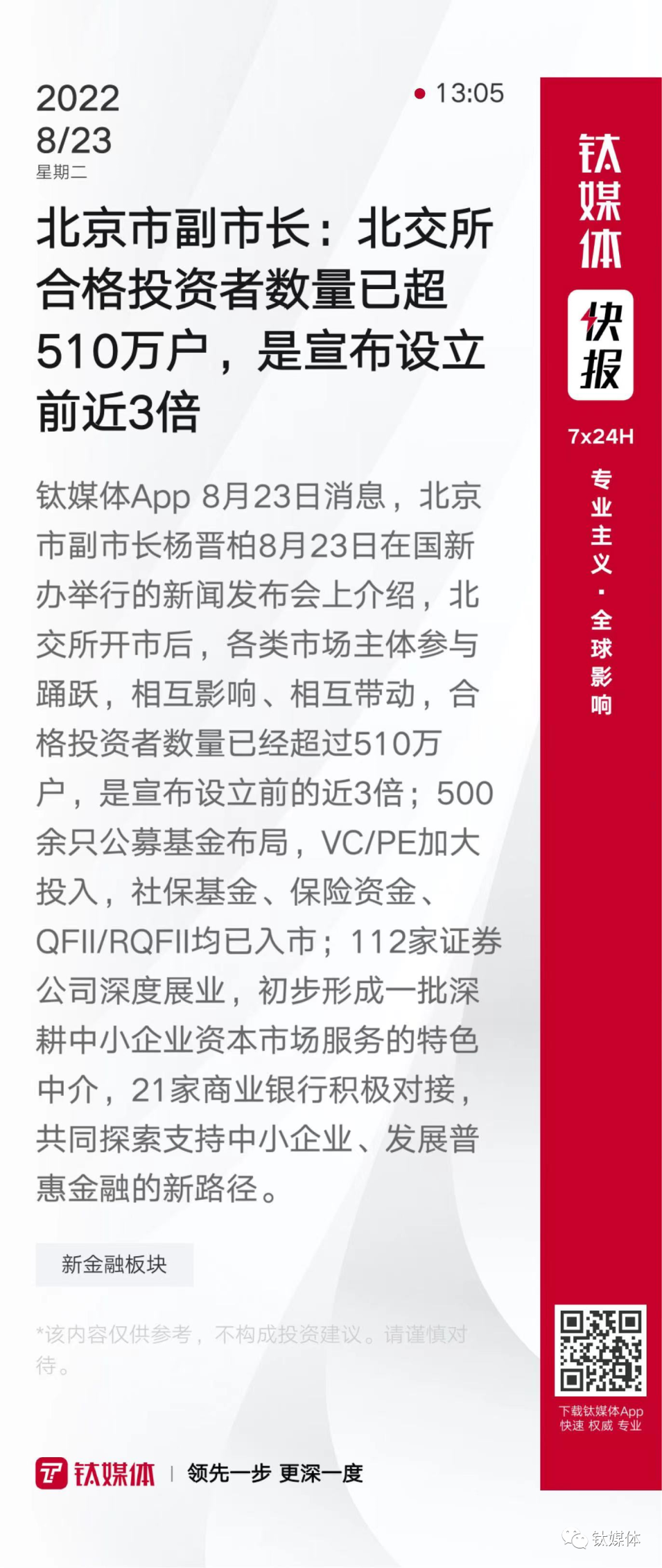 【北京市副市长:北交所合格投资者数量已超510万户,是宣布设立前近3倍】