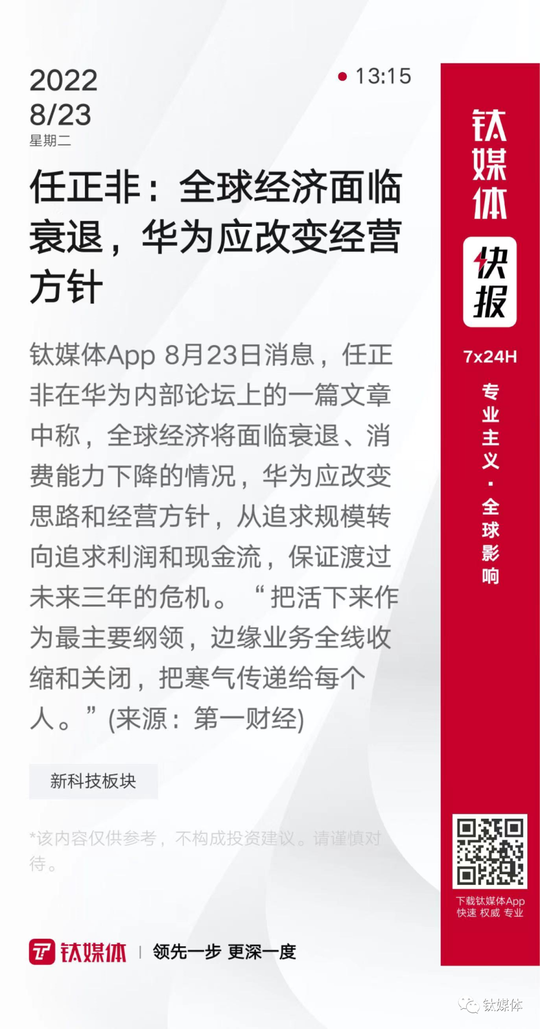 【任正非:全球经济面临衰退,华为应改变经营方针】