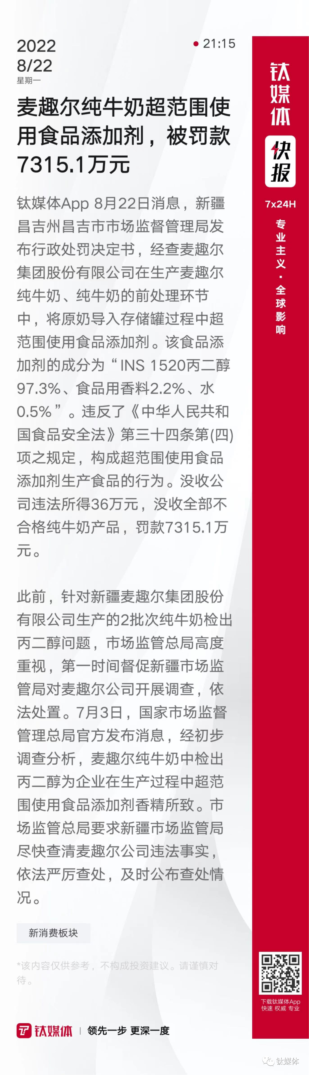 【麦趣尔纯牛奶超范围使用食品添加剂,被罚款7315.1万元】