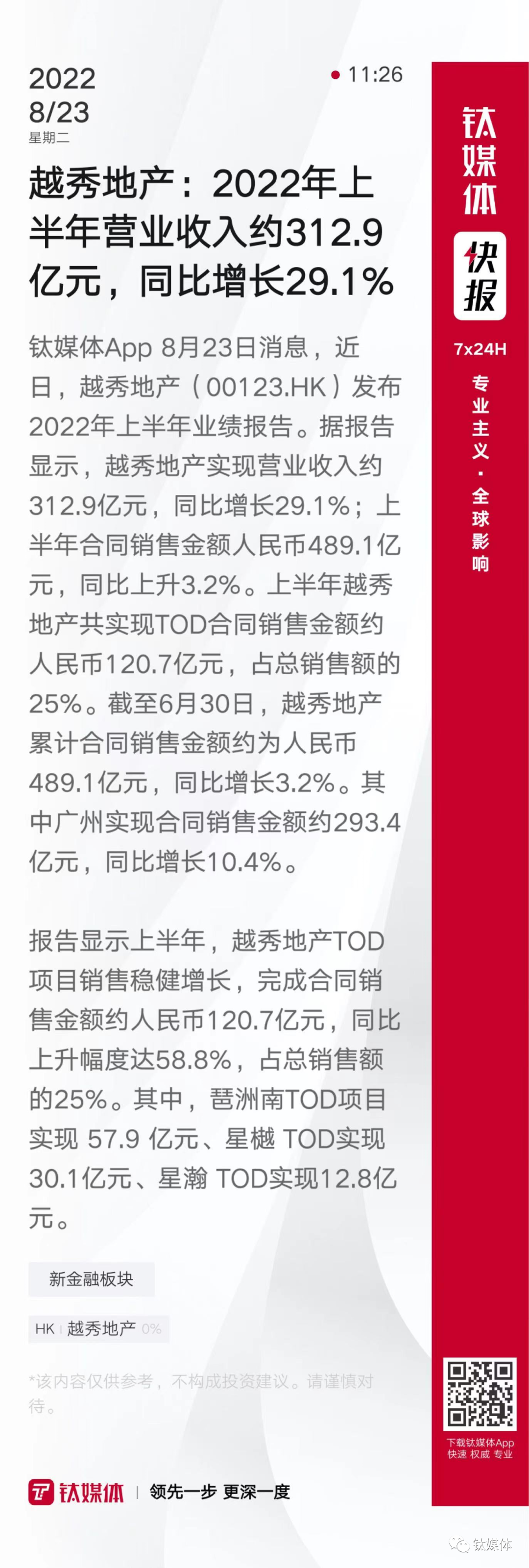 【越秀地产:2022年上半年营业收入约312.9亿元,同比增长29.1%】