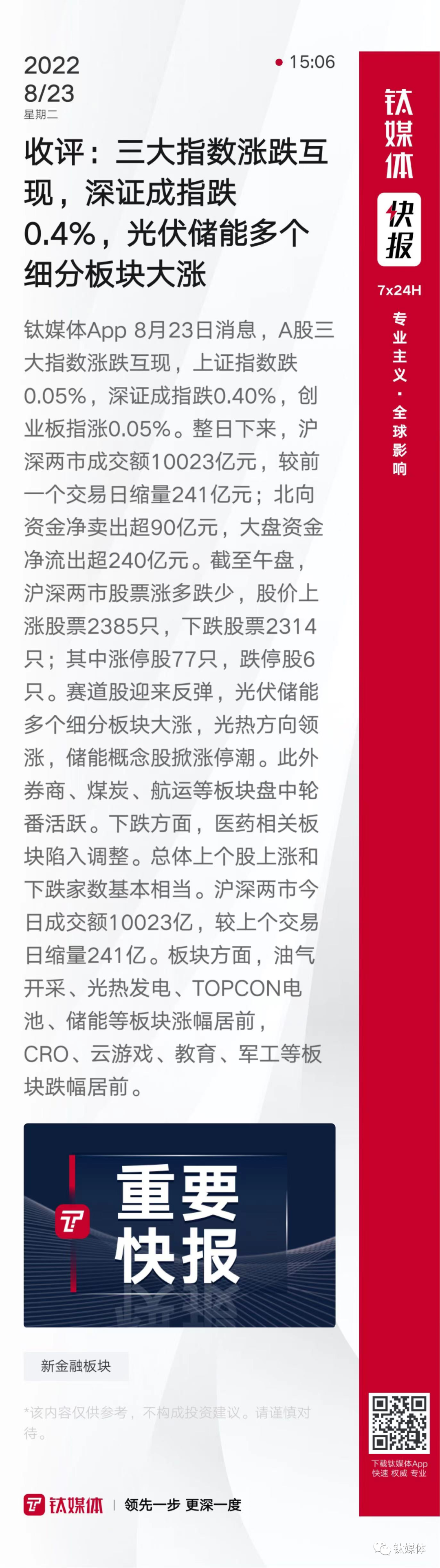 【收评:三大指数涨跌互现,深证成指跌0.4%,光伏储能多个细分板块大涨】