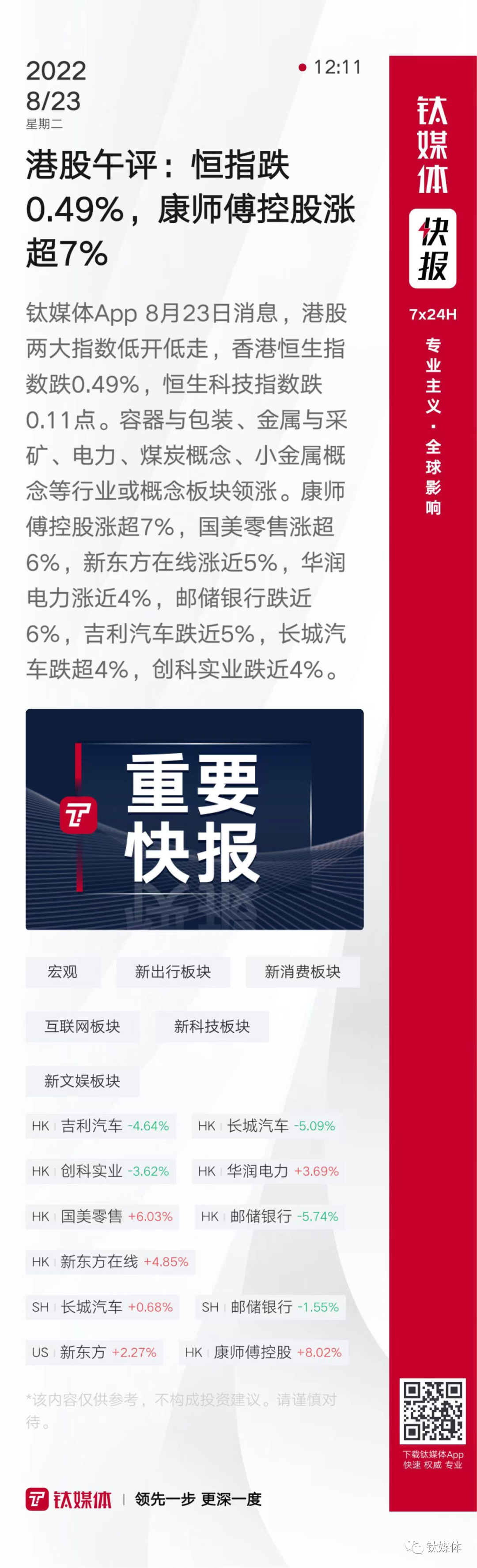 【港股午评:恒指跌0.49%,康师傅控股涨超7%】