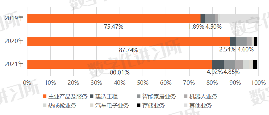 杭州海康威视数字技术股份有限公司(简称“海康威视”,002415.SZ)成立于2001年,2010年5月25日在深圳证券交易所中小企业板上市。公司是以视频为核心的智能物联网解决方案和大数据服务的提供商,在安防、智能物联领域耕耘二十余年,集视频监控系统的各类设备的研发、设计、生产、销售及系统于一体,主要面向政府和大中型企业,业内素有 “安防茅”的美称。海康威视专注于物联感知、人工智能和大数据领域的技术创新,提供各类软硬件产品,具备大型复杂智能物联系统建设的全过程服务能力。海康威视所提供的产品及解决方案从物联感知设备拓展到与人工智能、大数据技术充分融合的智能物联产品、IT基础产品、平台服务产品、数据服务产品和应用服务产品,从事的领域覆盖政务民生、智慧交管、应急管理、数字能源等众多方向。2017年,海康威视发布AI Cloud架构,融入了“云边融合”的理念,由“边缘节点、边缘域、云中心”三层架构组成,拓展出将传统信息化、设备设施物联、场景智能物联融于一体的数字化解决方案。海康威视逐步从视频监控厂商转型为智能物联网产品和解决方案供应商。据公司年报显示,在全球范围内,有超1000个城市使用海康威视监控设备。且海康威视在海外设立有66个销售分支和服务机构、3个制造工厂以及11个物流中心,共在155个国家和地区开展业务。据公司《2021年环境、社会及管治报告》显示,截至2021年底,公司累计有效专利数量5799件。此外,据A&S(工控自动化、汽车、电子制造等领域的专业化媒体)和IHS(咨询公司)的数据,海康威视连续9年位列全球视频监控行业市占率第一。据公司年报显示,自2019年到2021年,海康威视的营业收入保持着稳健的增长,从576.58亿元、635.03亿元增长至814.20亿元,2021年增幅达到28.21%,全部来源于智能物联产品及服务。公司归母净利润也保持着不断增长的趋势,分别为124.15亿元、133.86亿元和168.00亿元,2021年增长率为25.51%。2022年上半年总营收372.58亿元,同比上升9.90%;归母净利润为57.59亿元,同比下降11.14%。虽然2022年上半年归母净利润有所下降,但总体来看仍然保持着较为良好的发展趋势。图1:2019年2021年公司营业收入、归母净利润(二)主业产品及服务占总营收80%左右,创新型业务呈增长趋势海康威视的营业收入主要来自于主业产品及服务(以各类摄像机为代表的前端产品、以硬盘录像机和主机为代表的后端产品以及中心控制产品)、建造工程、智能家居业务、机器人业务以及新加入的热成像业务、电子汽车业务和存储业务,其中主业产品及服务占比从2019年到2021年间分别为75.47%、87.74%和80.01%,存在一定波动,但在总营收中保持最大占比,为公司目前的支柱业务。而以智能家居业务、机器人业务、热成像业务、电子汽车业务和存储业务为代表的创新业务呈现增长趋势,2021年总占比达15.07%。图2:2019年至2021年各业务营收占总营收比例(三)毛利率稳定在45%上下,2022年第一季度略有下降从2019年到2021年,海康威视毛利率分别为45.99%、46.53%和44.33%,总体保持在45.00%上下,较为稳定。在主要产品中,主业产品及服务毛利率最高,为46.36%,建造工程毛利率最低,为22.96%,创新业务毛利率为40.50%。2022年第一季度毛利率为43.72%,同比下降6.62个百分点,但仍然保持在比较稳定的水平。为了提升公司产品的竞争力,海康威视不断增加研发的资金投入和人员投入,并进行专利创新。据公司年报显示,2019年至2021年公司科研投入分别为54.842亿元、63.79亿元和82.52亿元,研发投入占营收比例稳中有增,2021年为10.13%。三年间公司研发人增加6287名,增至25352人,占员工总数的48.06%。其中,拥有本科和硕士学历的研发人员人数最多,分别占总人数的63.25%和28.24%。(五)公司客户群较广,近三年前五大客户总销售额均低于4%总体来看,由于公司产品业务分布较广、覆盖面较大,所以客户群的规模具有大而分散的特点。2019到2021年间,公司前五大客户总销售额分别为3.47%、3.09%和3.39%,2021年前五大客户销售额均低于年度销售总额的1%,基本不存在业务受到单一客户重大影响的情况。海康威视的业务可概括为3类支撑技术、5类软硬产品、4项系统能力、2类业务组织和2个营销体系。其中,3类支撑技术包括物联感知技术、人工智能技术和大数据技术;5类软硬产品包括物联感知产品、IT基础产品、平台服务产品、数据服务产品和应用服务产品;4项系统能力包括系统设计开发、系统工程实施、系统运维管理和系统运营服务;2类业务组织包括3个事业群(公共服务事业群、企事业事业群和中小企业事业群)和8个创新业务(智能家居、移动机器人与机器视觉、红外热成像、汽车电子、智慧存储、智慧消防、智慧安检、智慧医疗);2大营销体系包括国内业务营销体系和国际业务营销体系。公司的主要产品可划分为硬件产品和软件产品,解决方案覆盖政务民生、智慧交管、应急管理、数字能源等众多方向。海康威视的硬件产品共有23个门类。重点硬件产品品类包括前端产品、后端产品、存储产品、显示产品、控制产品、智能交通产品和数据中心产品。除此之外公司还有热成像产品、传输产品、门禁设施、对讲产品、安检产品、人员通道产品、报警产品、移动产品、会议平板产品、出入口停车产品、RFID&ETC产品(射频感知类产品)、车(船)载产品、网络安全产品、广播产品、网络安