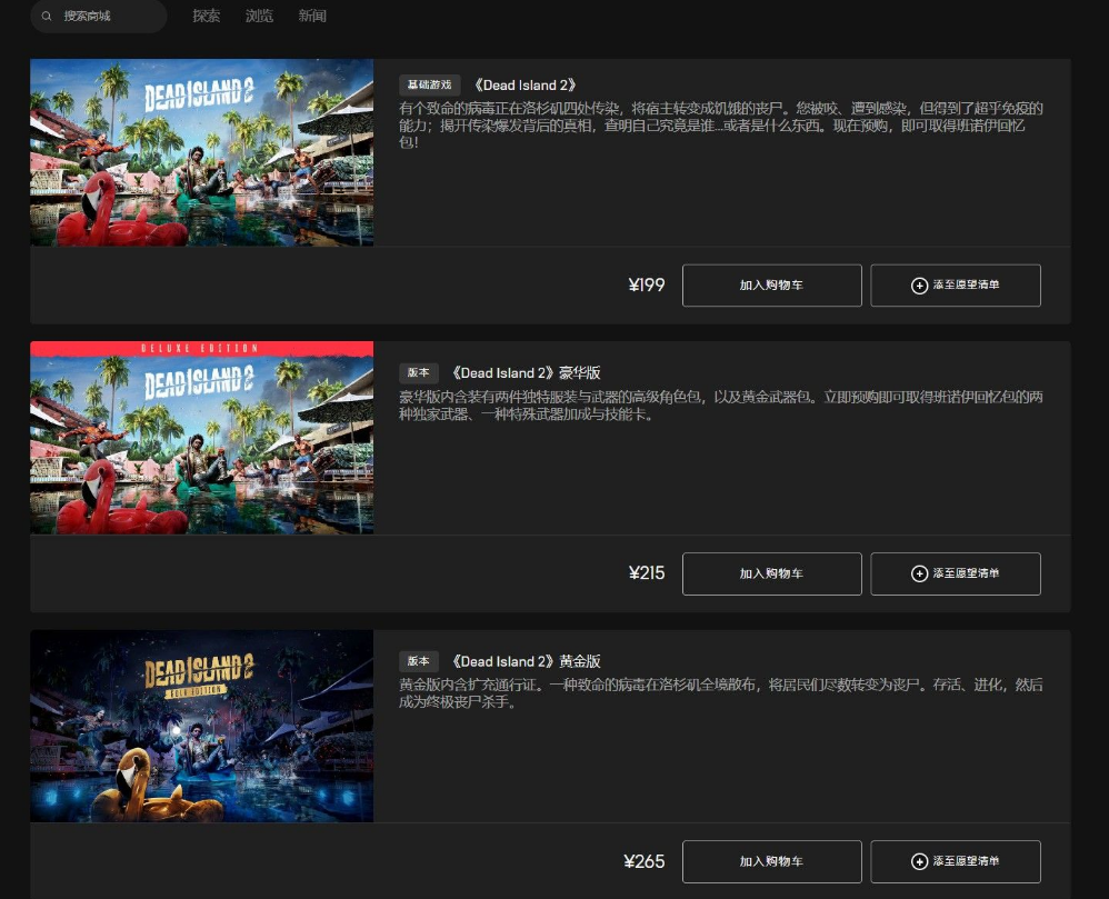 在今天凌晨(8月24日)举办的2022年「科隆游戏展」展前直播活动中,Deep Silver正式公开了经典开放世界丧尸游戏《死亡岛》的正统续作《死亡岛2》。本作的发售消息与此前亚马逊商店的页面信息一致,游戏将于2023年2月3日发售,登陆PC(Epic),PS5,Xbox Series X/S,PS4和Xbox One平台,Epic国区售价199元,现已开启预购。![]()
