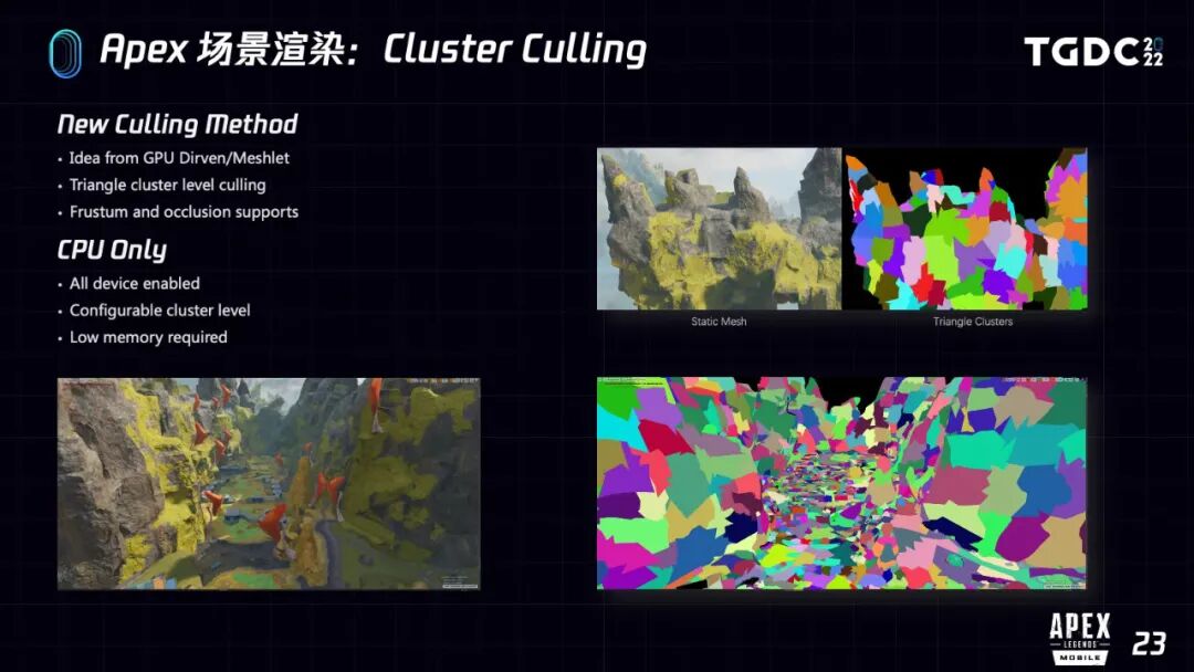 而在《Apex Legends Mobile》项目引擎组负责人Aiken分享中,他针对这款手游产品的场景渲染优化进行了具体剖析,包括对已有方案的使用和改进。同时他还介绍了合批机制和基于三角形簇的裁剪管线,详解项目在性能方面存在着还原度、高帧率、适配性三大挑战,而通过场景渲染优化、RenderPass等一系列解决方案,最终一一化解了这些难题,为玩家带来了更高品质的游戏体验。