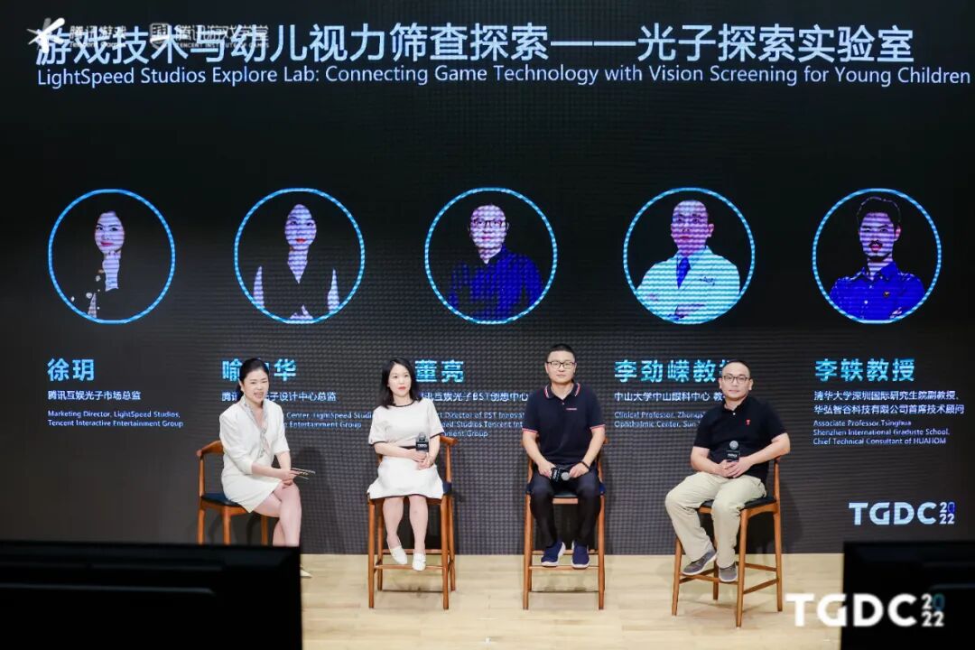 讨论环节中,腾讯互娱光子市场总监徐玥,腾讯互娱光子设计中心总监喻中华,腾讯互娱光子 BST 创想中心产品总监董亮,中山大学中山眼科中心教授李劲嵘教授,清华大学深圳国际研究生院副教授、华弘智谷科技有限公司首席技术顾问李轶教授,详尽地分享了游戏技术助力幼儿视力筛查的落地实践。