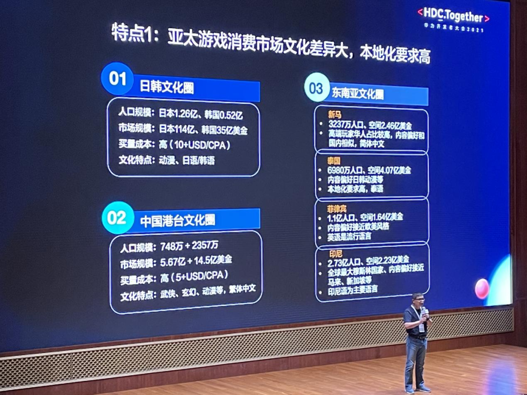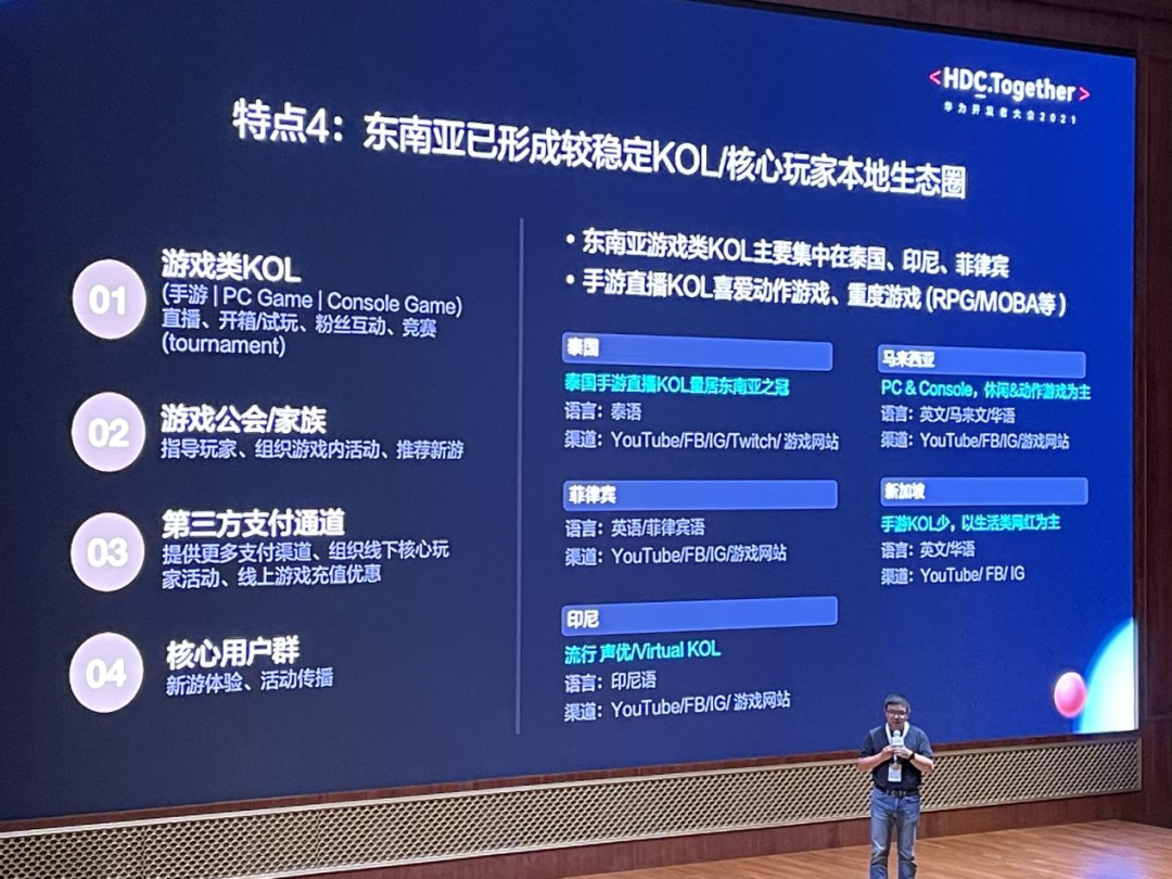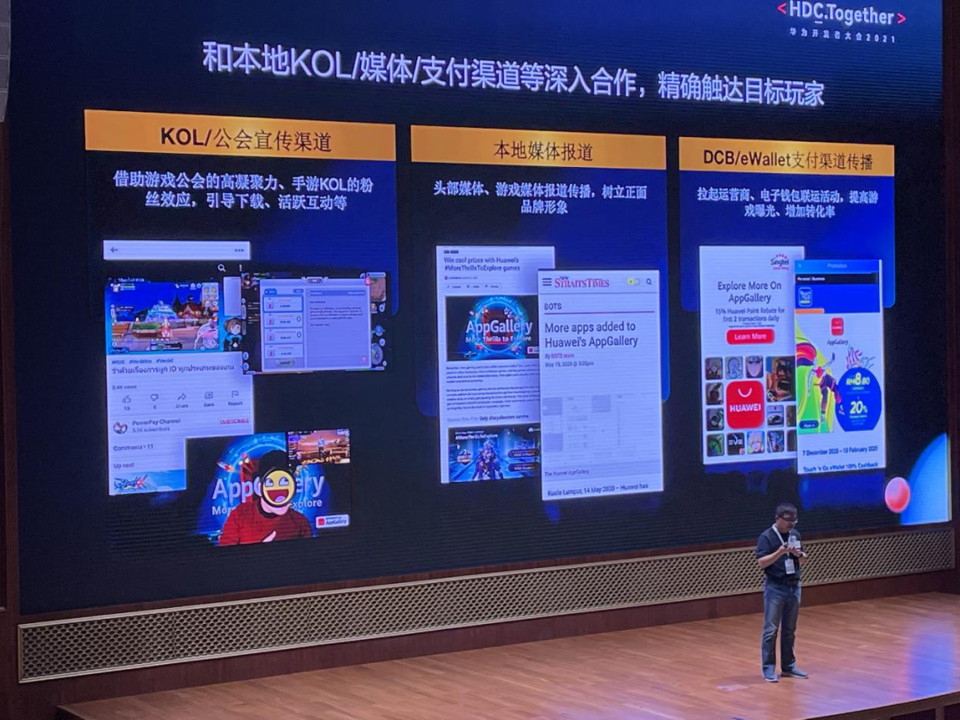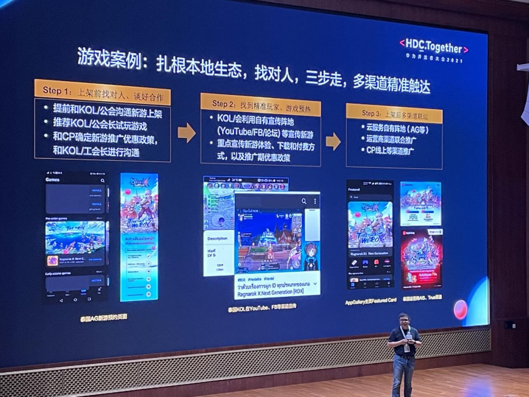 10月22-24日,HDC华为开发者大会2021在华为松山湖召开,在“领航出海高峰论坛”上,来自华为消费者云服务亚太云服务运营部部长单雪峰发表了题为“对亚太市场洞察和HMS运营案例”的演讲,他以《RO》如何通过东南亚稳定的KOL优势和华为在海外的资源优势进行推广做了案例分享。