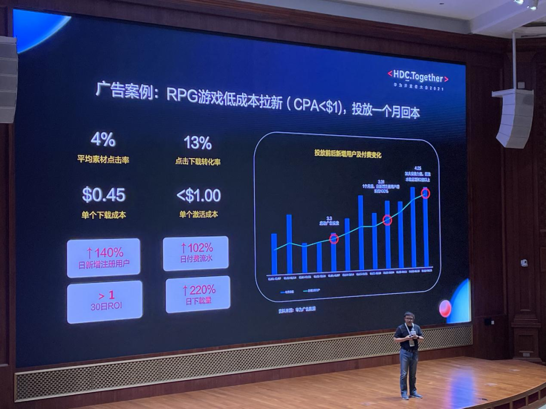 东南亚高端华人玩家占了经济贡献的绝大多数,而这个因素就决定了华为的广告平台是唯一一个能够主打东南亚高端华人用户的平台。华为能够精准地让我们的游戏抓住高水平的游戏用户,这是华为的广告平台的第一个特点,能够触达高品质的用户。第二个特点,就是华为开放了很多内部精准的标签用于广告的投放。举例说明,用户装过什么样的品类?过去三天有什么付费?这个用户到底是哪一种范围的终端手机情况?这是非常关键的。我们开放了100多个标签,其中这些标签里面重点列了几个是最重要的投放标签。第三的话华为还丰富了流量入口。除了刚才我介绍的华为应用以外,我们还整合了超28,000个第三方媒体,包括新加坡的新闻报、马来西亚的新洲日报,还有中国报等当地最主流的媒体。这些媒体集成了华为广告的能力,华为的广告平台可以通过它来触达消费。所以整体来说,我们借助华为的广告平台能力、流量以及本地化运营团队,我们也做的相对成功了。从去年7、8月开始到今年,我们做成功了很多很好的游戏。这些游戏在我们平台获得成果,例如:第一个游戏《RO》,游戏在上线的第一个小时流水便超过2万美元,上线40天流水超过1000万美元,上线4个月流水就超过3000万美元。从它每个月流水的对比趋势情况可以看出来,整体来说,华为在付费玩家、数值和流水上都获得了成功。第二方面,为什么《RO》能在我们平台上获得成功?我们其实做了三件事:第一件事就是产品磨合。《RO》游戏本来不打算在华为平台上首发,但是在争取到同步首发之前,我们就事先在华为平台做了预约,在预约的时候,我拿着这个游戏找到泰国等几个国家的主要的核心网站和KOL\工会试玩,在得到他们集体好评后,我们便在Facebook、YouTube、Instagram等海外主要渠道上做视频投放宣传,这就是第一件事。第二件事的话,我们通过KOL\工会长把核心玩家找到,核心玩家在上线之前期待游戏的上架,而在游戏上架前我们就已经把支付的方式和服务措施都做好了,所以上架后玩直接可以进入游戏了。第三个是上架后,我们还做了大量用户的线上和线下活动,最终使这个游戏获得成功。当然,游戏公司也和我们有着比较紧密的配合。另外一个游戏的案例,就是借助我们广告平台做了一些投放。在该游戏投放了一个月后,从素材的点击率到现在下载的转化率再到单个下载的成本,都比单个激活成本低多了。为什么能达到这一步呢?我们其实就做了三件事:第一件事,我们把所有的渠道都进行了推广;第二件事,我们给游戏开放了标签,前提是是否有玩过RPG游戏和在30天内是否付费的标签,通过标签可以精准触达用户;第三件事,在投放市场之后,通过AI做了一个 CPA的优化自动投放,整体效果还是比较好的。这次的分享就到这里,希望大家多支持华为,多来亚太发展,我们会做好稳定的支撑,谢谢大家!