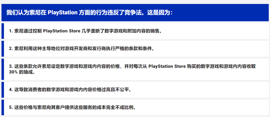 上周五,英国消费者权益倡导者Alex Neill以“欺诈用户”为由向索尼发起了集体诉讼。在相关说明文中,Alex指控索尼违反了英国竞争法,通过“滥用其垄断性的市场力量”,对游戏开发商与发行商施加不公平的条款,具体体现为30%的平台方收入抽成,而这也在无形之中迫使消费者在游戏上花费了更多的金钱。