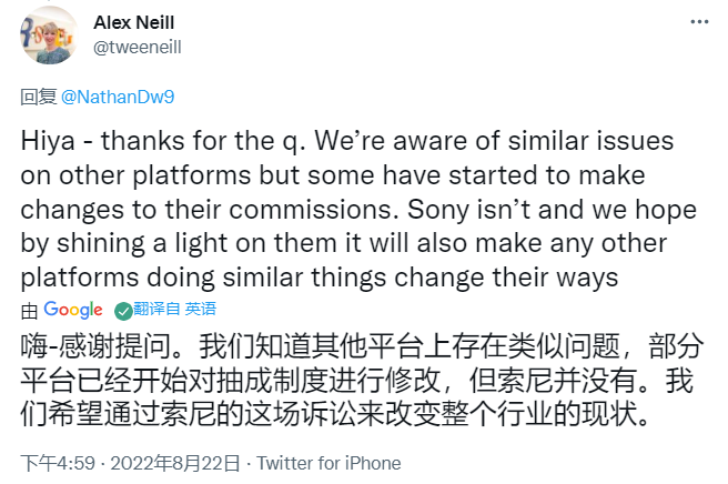 当被问及为何要针对索尼时,Alex在她自己的推特中表示,部分厂商已经开始着手解决这一问题,但索尼显然没有。事实上,索尼曾在3年前因禁止第三方渠道购买数字版游戏一事变相垄断了玩家获得游戏的途径,针对索尼展开诉讼似乎是赢面最大的选择。
