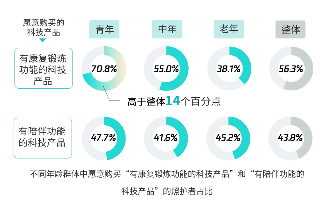 青年照护者对康复锻炼类的科技产品展示出更高的热情,有70.8%的青年照护者愿意购买康复锻炼类的科技产品,高于整体14个百分点。而陪伴类的科技产品几乎是个各个年龄段的都比较偏爱的类别。