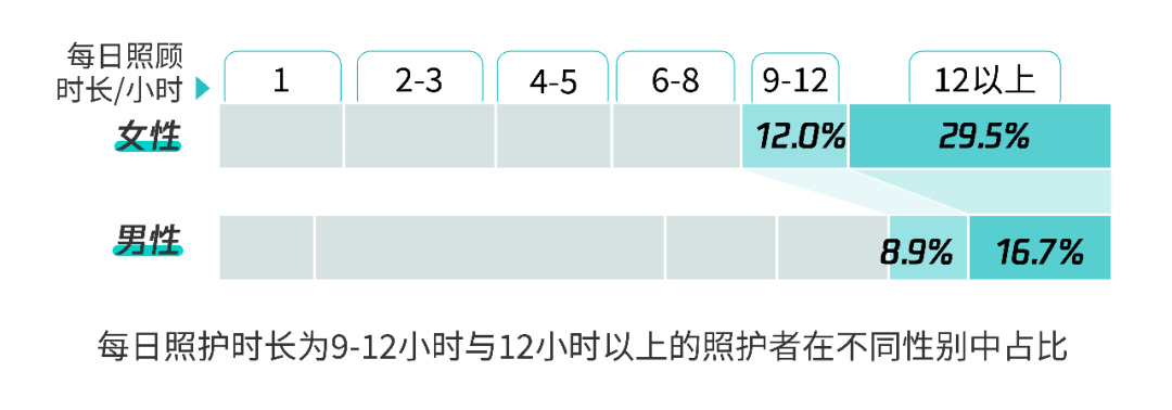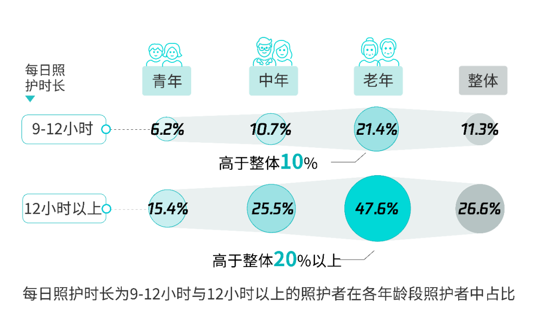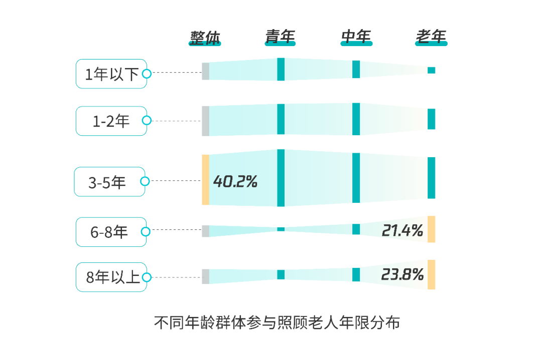 我们在调研中发现,大部分居家照护者的照护年限为3-5年,也有一定数量的照护者会达到8年以上。而在这其中,老年照护者的照护年限要显著高于其他人群,她们中照顾老人8年以上的比例为24%,高于整体12个百分点。