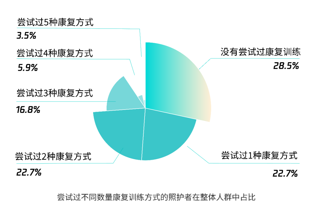 因为对认知症不了解,与没有继续看病、吃药,顾大哥也就没有给老人尝试过任何康复训练。在我们的调查中,大多数照护者带老人尝试过1-2种康复训练的方式,其中占比较高的是音乐、运动、回忆疗法,但也有超过1/4的家庭从未尝试过康复训练。