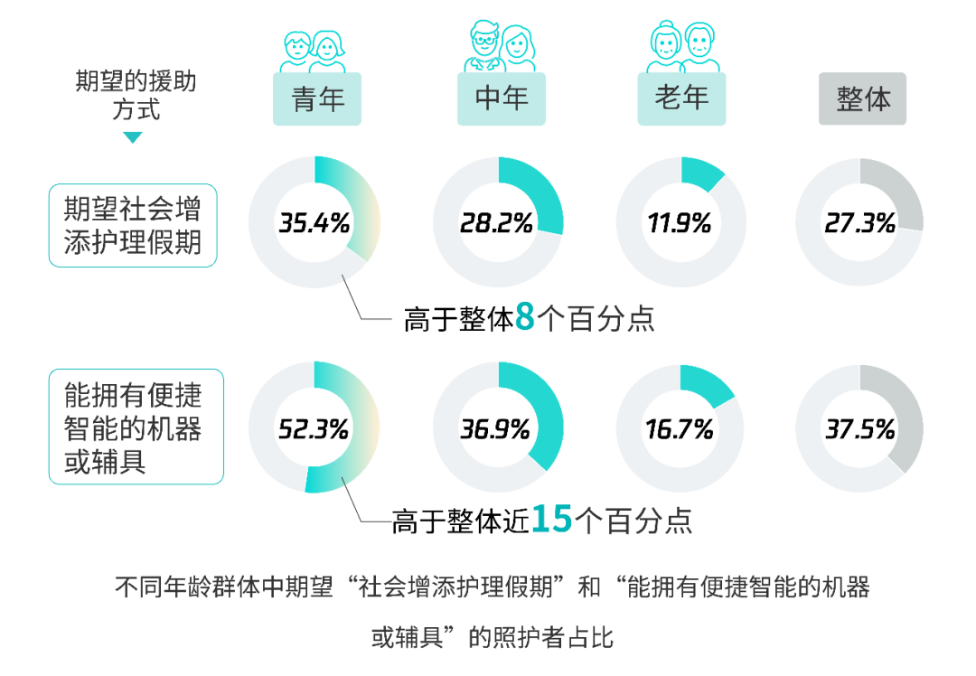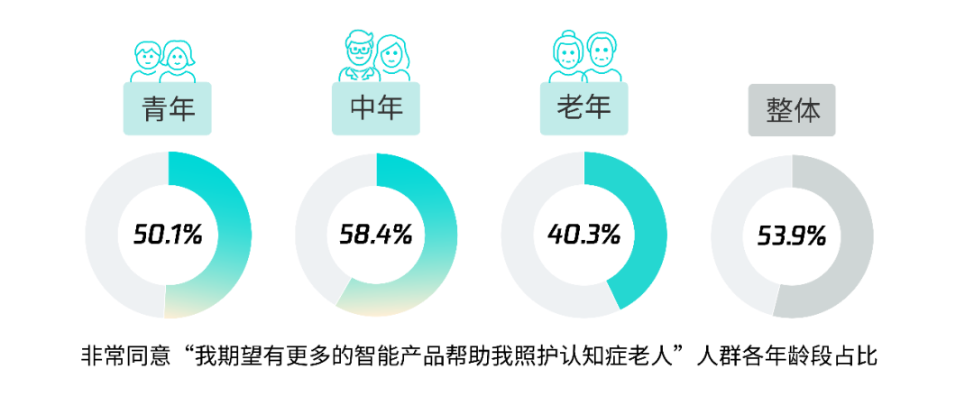 但是,我们还注意到,负担感知更高的人,他们对科技未来的应用是更加期待的。比如中年照护者对科技产品展现出更高的期待值,有58.4%的中年照护者期待有更多的智能产品帮助他们照顾认知症老人,是所有人群中最高的。