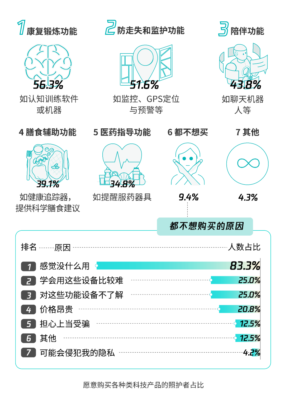 在我们的调研中,有9.4%的照护者与徐先生一样,表示自己一样科技产品都不想买。究其原因,“感觉没什么用”的照护者占比83.3%,远超其他选项,可见“有用”永远是最朴素、最坚实的诉求。