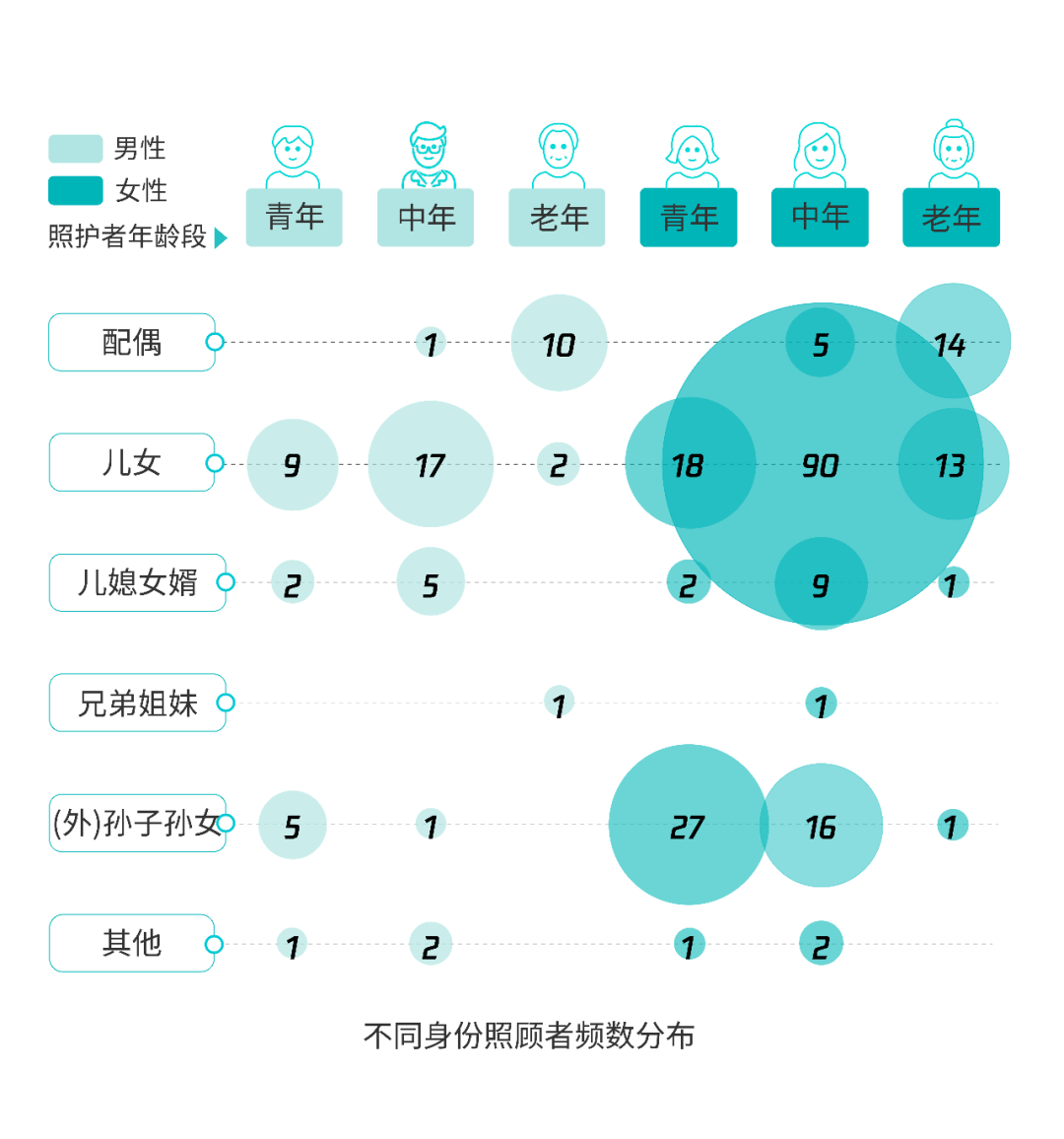 与肖大姐情况相似的照护者有很多,在我们的调研中发现,认知症老人的家庭照护者大多是人到中年的女性,她们的身份是老人的配偶、女儿、儿媳等等。