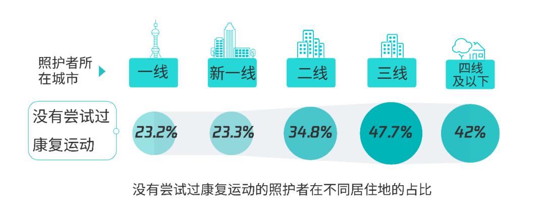 在三线及以下城市和农村,没有尝试过任何康复训练的家庭超过40%。