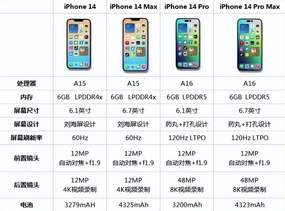 iPhone 14和iPhone 14 Max搭载A15芯片,仍然有Face ID刘海屏凹槽,不支持ProMotion显示,配有1200万像素的广角摄像头,具有f/1.9光圈和自动对焦功能。这两款机型支持Wi-Fi 6E显示,具有6GB内存,配色方案有紫色、红色、白色、黑色、蓝色五种。iPhone 14 Pro和iPhone 14 Pro Max搭载A16芯片,从“刘海屏”变成了“叹号”打孔屏,支持120Hz的ProMotion显示,配有4800万广角摄像头和1200万超广角摄像头,能录制8K视频。这两款机型可能采用钛金属框架,配色方案有石墨色、金色、银色、紫色四种,最高可能支持2TB储存空间。![]()