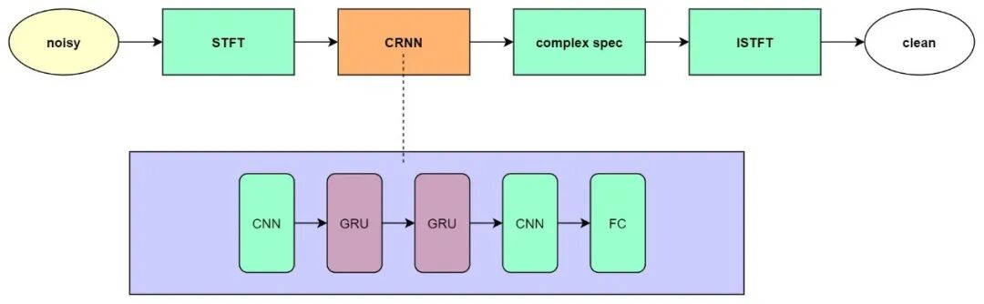 语音降噪通常采用有噪声语音的短时傅里叶变换(STFT),只增强幅度谱,而保持相位谱不变。这样做是因为人们相信,相位谱对语音增强并不重要。然而,最近的研究表明,相位对感知质量很重要。我们的方法使用深度神经网络来估计在复数域中的理想比值Mask的实部分量和虚部分量,这种方法更好的保留了语音的质量。同时以更小的模型参数达到了大模型同样的降噪效果。原始的AI降噪模型,模型大小大概3M,固定测试集mos分为3.1。对模型做一些剪枝同时调整模型结构,再针对模型输出目标进行调整,在保持3.1的mos的情况下,最终模型大小降为900k。![]()