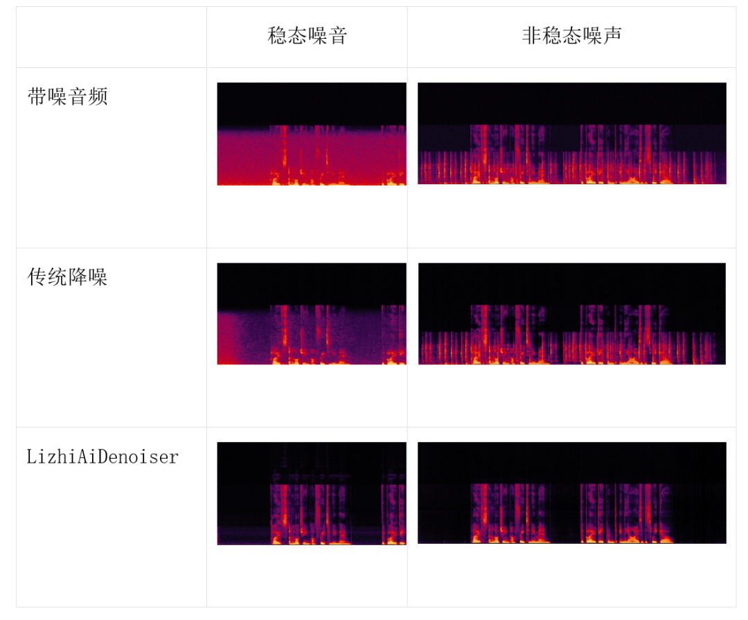 如上效果所示,LizhiAiDenoiser在不同信噪比和场景下,取得了不错的效果。这里测试40db和50db的音频,主要是为了测试LizhiAiDenoiser对近乎纯净语音有没有损伤,从最终结果能够看出,LizhiAiDenoiser对于纯净语音几乎不产生损伤情况。结论:在语音的中频部分能看到LizhiAiDenoiser降噪后对语音保留的更好。